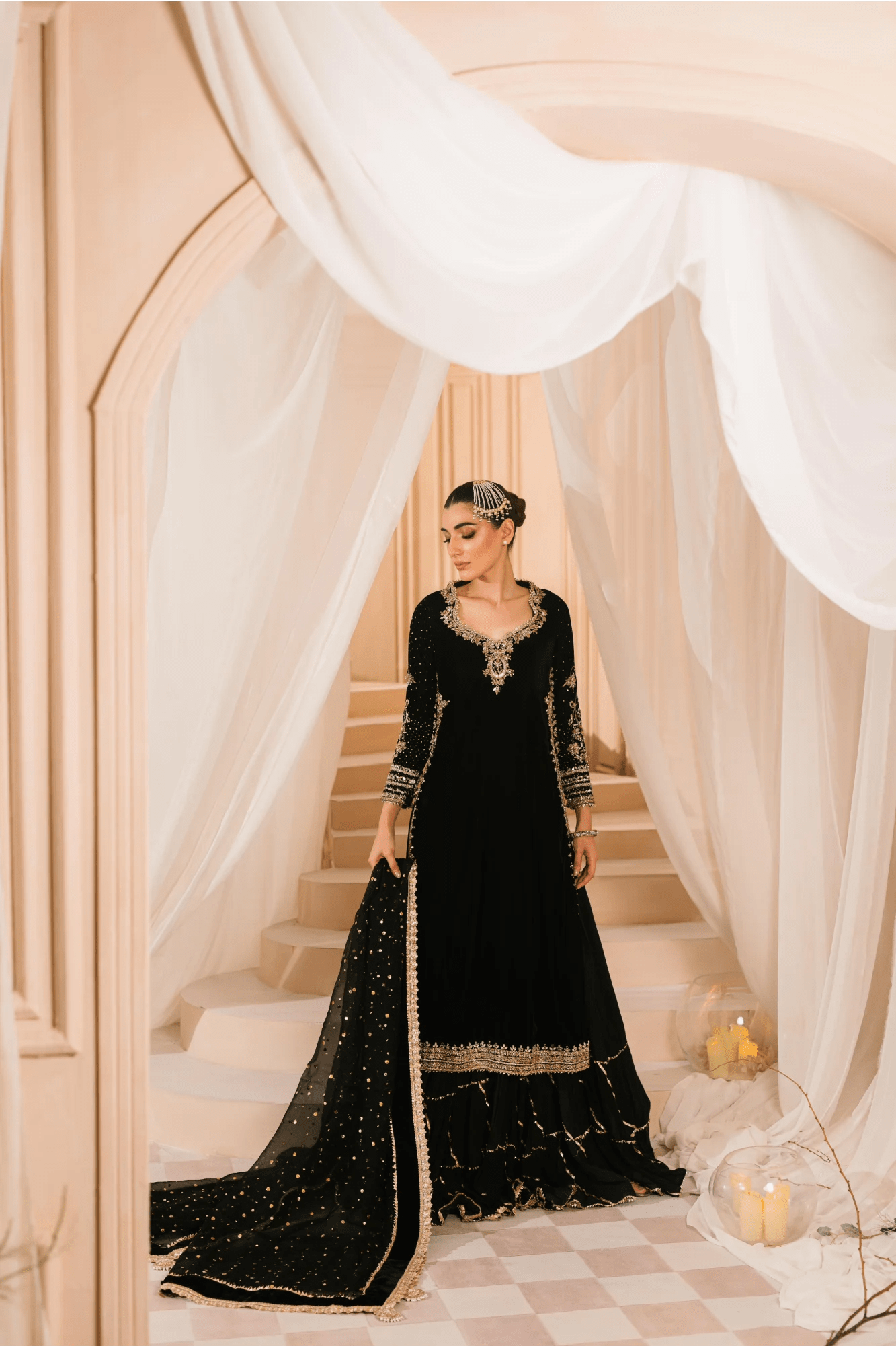 The empire high side slits handcrafted in dabka and sheesha elegantly sway, accentuating the sharara’s refined silhouette. While the kamdani organza dupatta cascades softly, its luxurious velvet edges and chand baali tassels glinting with jewel-like brilliance.