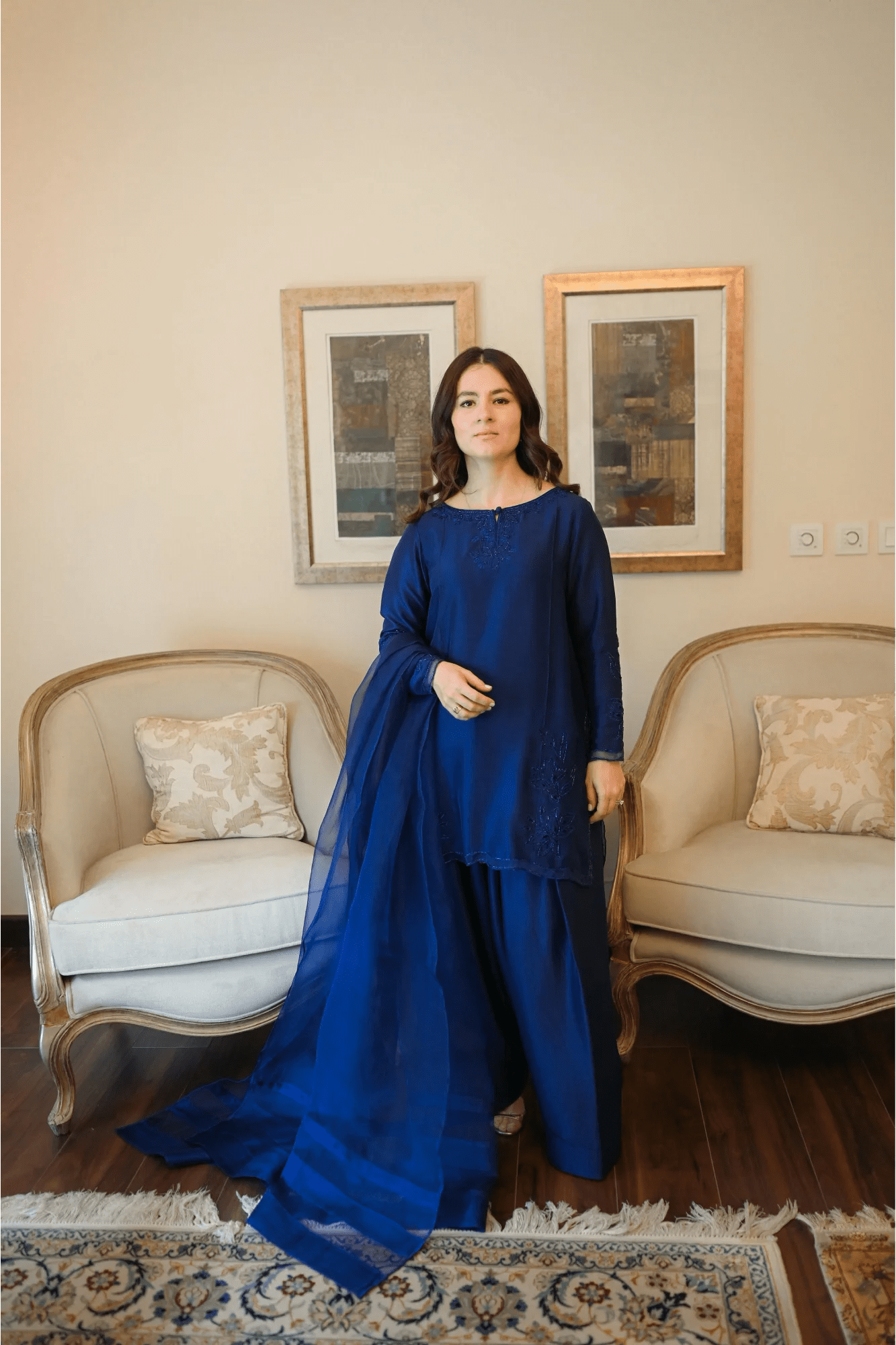 2pc. made to order Embroidered organza shirt in a warm beige tone, with hand crafted crystal and pearl embellished straps on the shoulder adding a festive touch to the shirt. Pin tucked back and sleeves finished with delicate laces and resham work in pastels. In love with the eye catching 3D floral details!